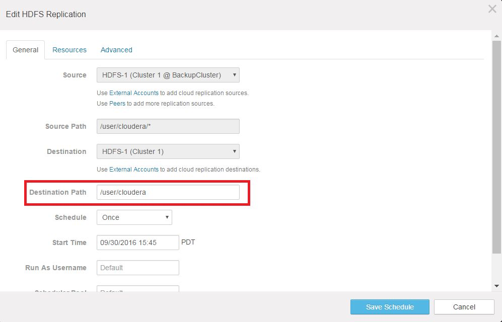 With the peer relationship established from destination to source, create a schedule to replicate HDFS files from the source (production cluster) to the destination (backup cluster).